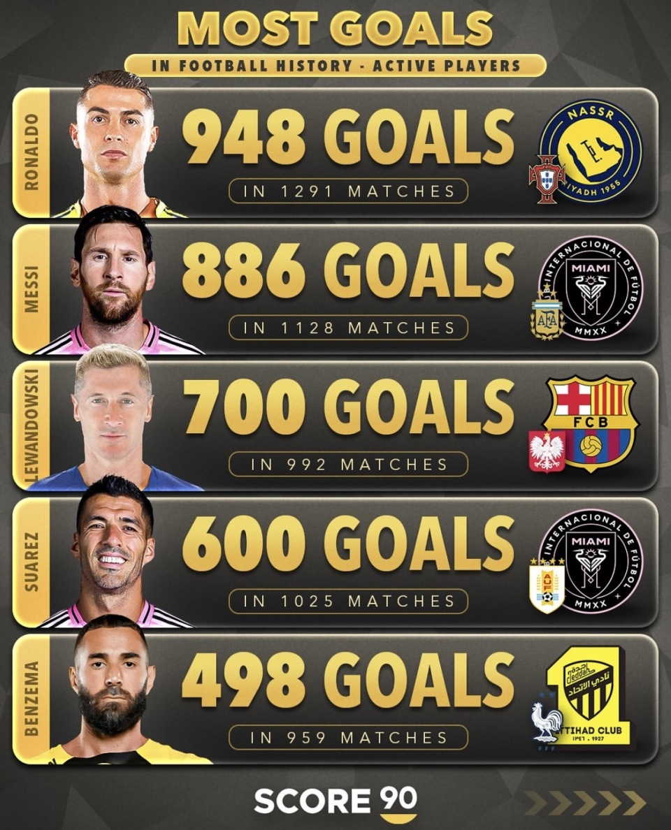 足球媒体Score 90发布“现役球员历史总进球榜”,统计俱乐部与国家队正式比赛总进球,数据截至北京时间2025年10月19日(10月19日)。C罗与梅西领跑,凯恩、莱万、苏亚雷斯、本泽马、内马尔、胡尔克、卡瓦尼、哲科均进入前十。